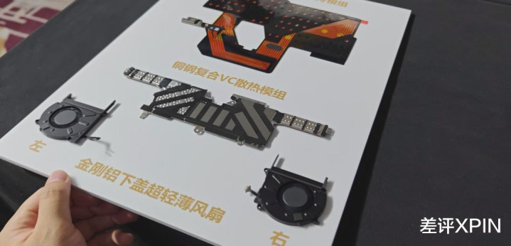 华为在活动现场还把散热系统给我们拆出来了,双微泵液冷膜 + 均热板组成的是被动散热,均热板的末端两侧还有两个超薄涡扇。
