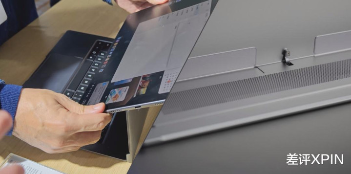 然后直到活动现场,托尼才发现它其实是一台设备,它的连接方式也非常巧妙,键盘本体有一个能展开的磁吸支架,平板又自带一个神似微软 Surface 的铰链支架。