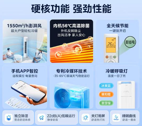 风不吹人设计是这款空调的一大特色,它通过上下出风的方式使得空调能够更加均匀地送风,避免了直接吹向人体造成的不适感。耐高温性能则让这款空调在高温环境下也能保持稳定的运行状态,不会因为过热而出现故障或性能下降。智能控制功能则让用户能够通过手机APP或遥控器远程控制空调的运行状态,提升了使用的便捷性。节能省电功能则能够减少空调在运行过程中的能耗,为用户节省电费。